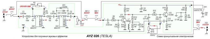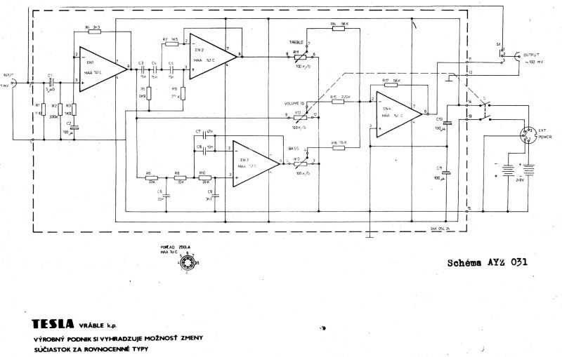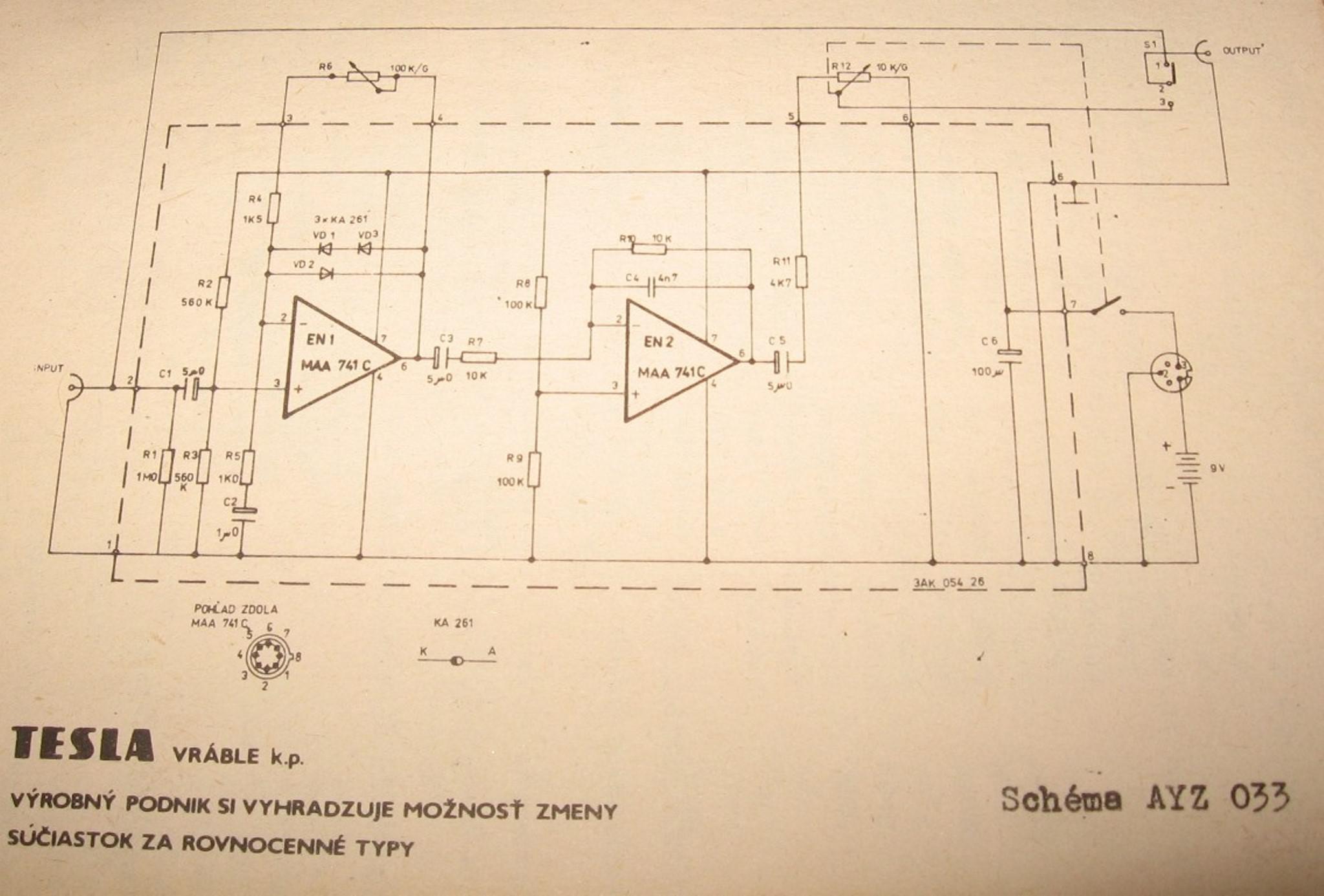 This is the Tesla "Attack Equalizer" (AYZ 031). It is a 2-band EQ pedal with a Bass, Treble and Volume control. To see the schematic
