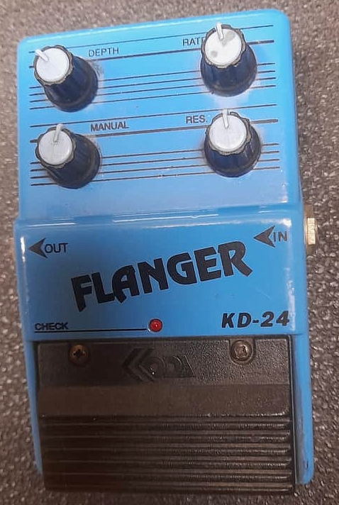 There were three different enclosure designs, shown below. The first type is wider (KOD series 1) with a small(er) plastic foot switch and were in various colors. The bottom of this example has a sticker on it that says "Elektronika IP-20". The second type is the KOD series 2 (NG product line). These were offered only in black, and only the graphics & knob colors change with each model. These have a larger DOD style plastic foot switch with "KOD" molded into the plastic and used the same wider enclosure. The third type, the KODA KD series is narrower. These seem to vaguely follow the design of the USA made DOD pedals but are not blatant copies like the Russian "Union" pedals. The KODA example shown below, the blue KD-24 Flanger, has the "KODA" trademark molded into the plastic on the footswitch instead of the "KOD" found on the KOD series 2 units, and is now less like the DOD foot switch. Not sure what the story is behind the name change from KOD to KODA. Likely another detail that has been lost to history. I still have lots of questions about these pedals.