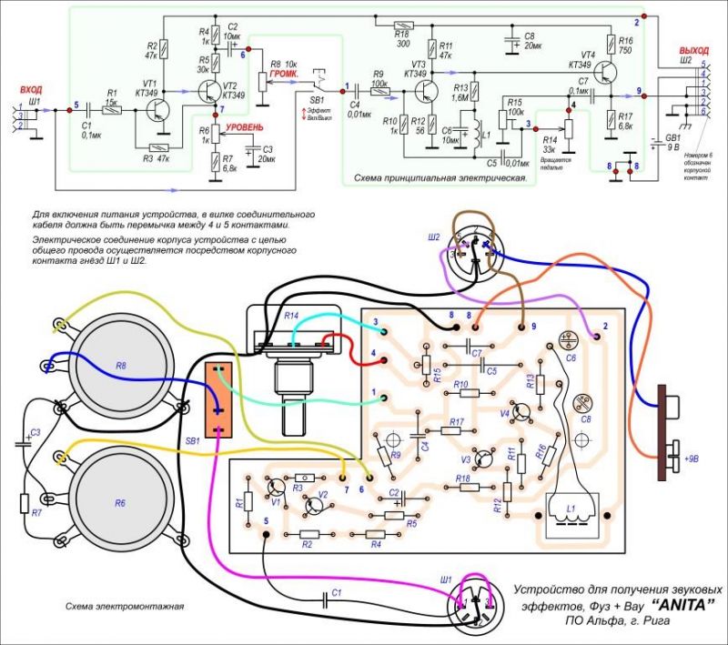 This is the "SPEKTR-2", a fuzz-wah. It uses a pair of toggle switches that poke thru the treadle to turn on/off each function. To see the schematic
