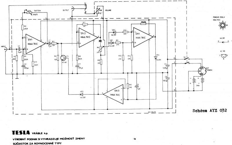 This is the Tesla "Compressor-Sustainer" (AYZ 032). It is a compressor-sustainer pedal. To see the schematic