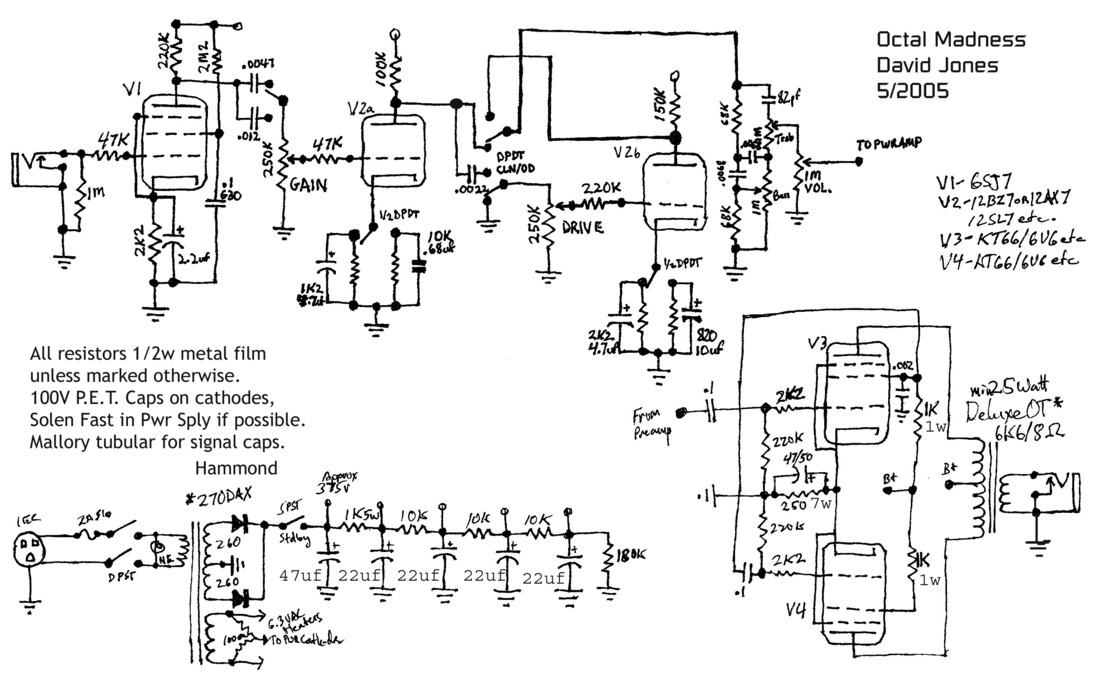 Build An Octal Madness Tube Amp - Build the Octal Fatness' big brother. Hosting schematic only (at this point) for David Jones, the designer of the circuit.