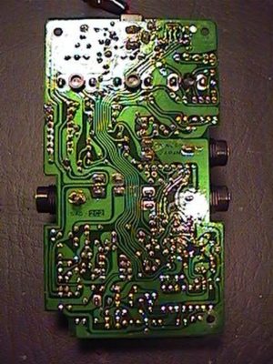 Below is a picure of the bottom of the PCB. It's coated with that usual green stuff you see on