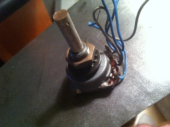 Here the pot mounting bracket has been removed. The gear on the pot is also made of brass and has a small set screw. The pinion attached to the treadle is made of plastic.