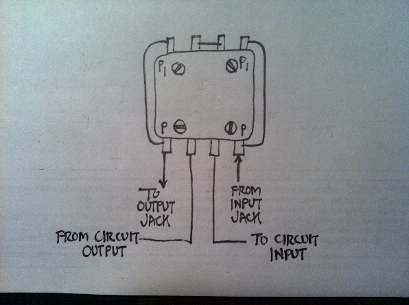 Here is how the bypass switch is wired. The switch is apparently a four pole double throw oddity which is wired to be true bypass.