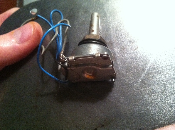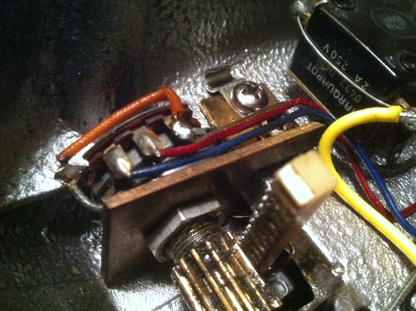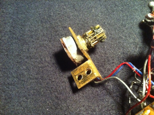 The pot, made by ESA, is mounted in an interesting way. Instead of using an intricate casting with some amount of machining like what is used in other designs, they simply used a brass mounting bracket attached to the casting with a couple of screws. There is a place in the casting where a pot could be mounted in a similar fashion to the Maestro Boomering but the toggle switch occupies the space where a pot could be mounted.