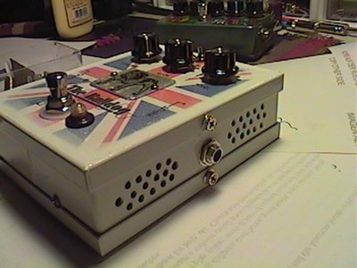 limiting resistor. Not shown in this picture is an added treble cut switch just above the gain control which switches in a 0.015uF cap to ground on the circuit output to smooth out the highs a little bit and makes the tone control a little more friendly. |