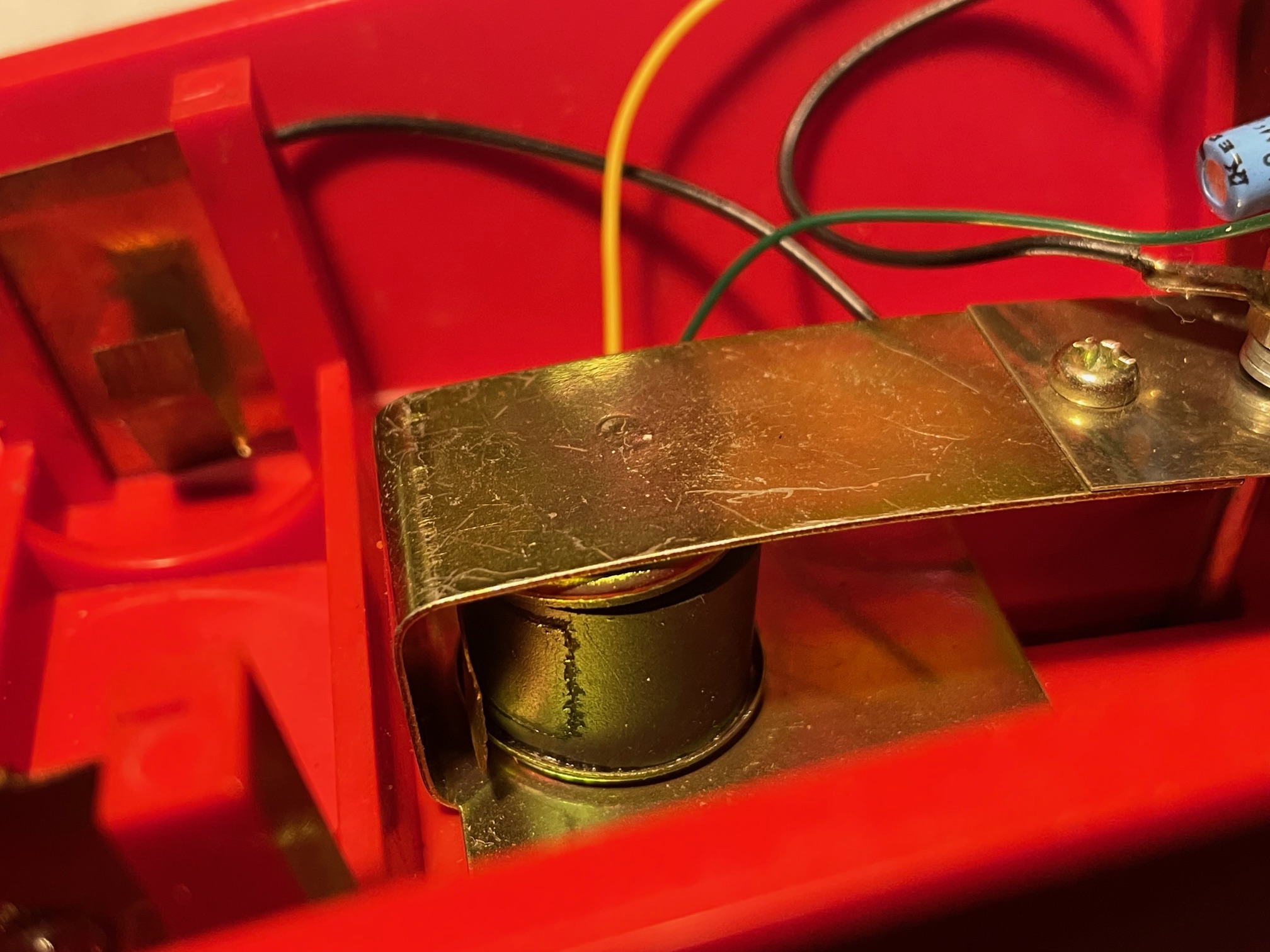 enclosure. The flat spring assembly is held in place by standoffs that were melted flat. One of those broke off in my example, leaving one
