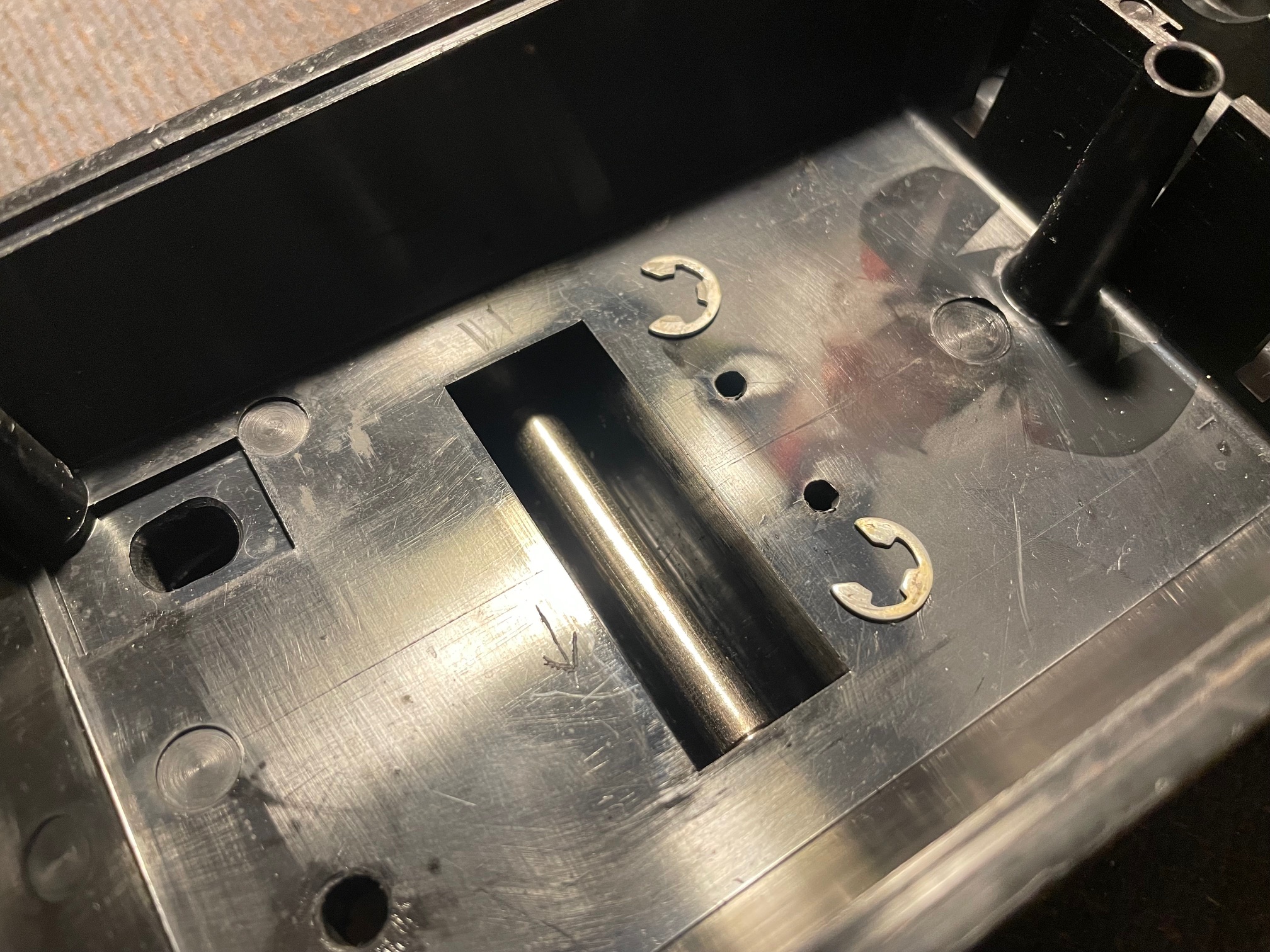 The treadle is held onto the shell by this shaft which is secured by a pair C-clips. I removed these so I could take off the