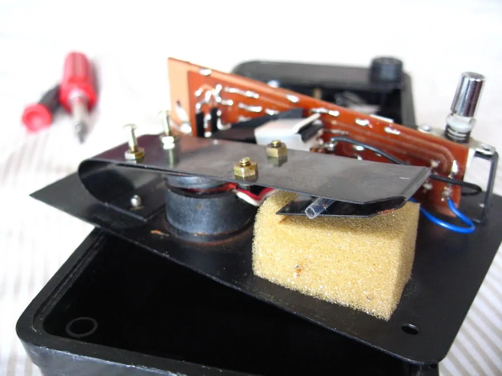 Here is what it looks like with everything reassembled. The wah effect is governed by how close this piece of ferrite on the spring is to the inductor, which