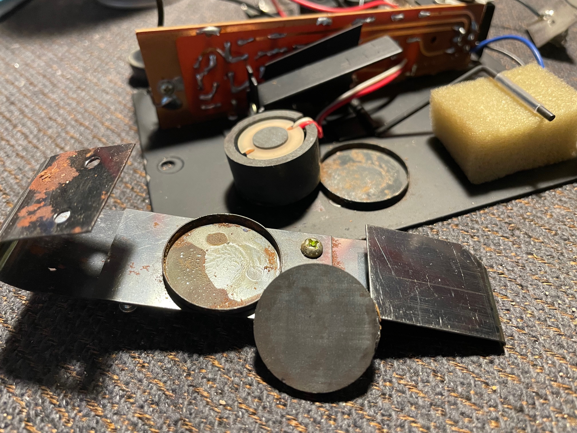 To fix mine I used a healthy amount of superglue to affix it to the bottom plate. The round ferrite disc that is attached to the flat spring also