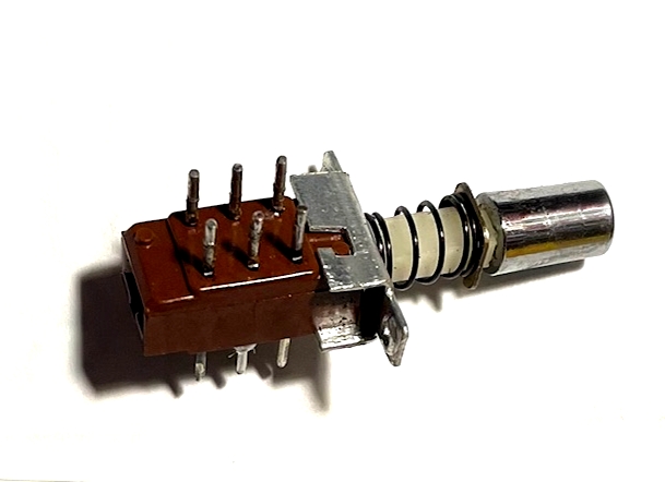 So I went on a quest to find a replacement switch and could not find anything exactly like it. The closest thing to a drop in replacement was a Schadow F2UEE latching type, which I confirmed will fit into the PCB, but it does not take care of the aforementioned problem I had with the original arrangement. After a few days of debating about how to make it be how I wanted it to be, I came to the conclusion that I really needed a type of switch where the plunger always returned to the same position, like the standard "stompbox" switches we are all used to. I investigated using a Philmore 30-005 DPDT Push-ON / Push-ON minature type switch so I could use the temporary switch bracket I had made but it was still too problematic due to the switch height and the pointy end of the plunger.