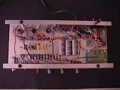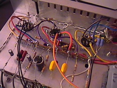 Here the chassis wiring is complete. I used wire from a dead computer power supply, which is rated for 300 volts. It gave me lots of different colored wires and didn't cost me anything. I kept all wiring runs as short as possible and followed good design practice everywhere that I could. One small change I made is powering the indicator lamp with the 6.3V heater supply instead of 120V as shown on the schematic. |