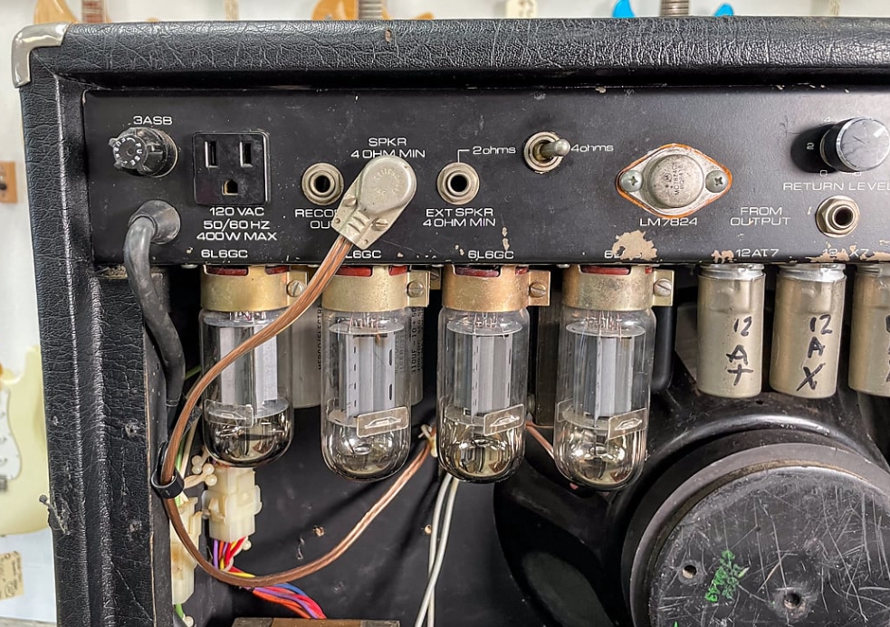 Looking at the back, we can see it was designed around four 6L6s. To the right of the power tubes are an array of