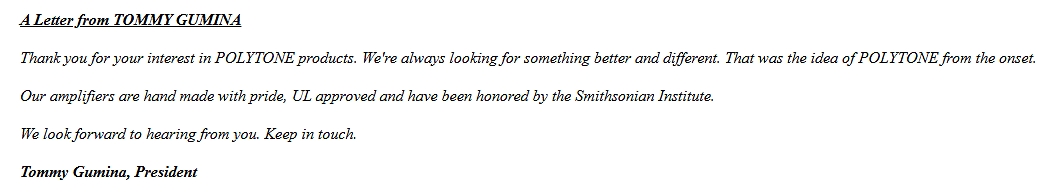 This webpage attempts to provide an overview of all the various Polytone amplifiers that were offered while the company was
