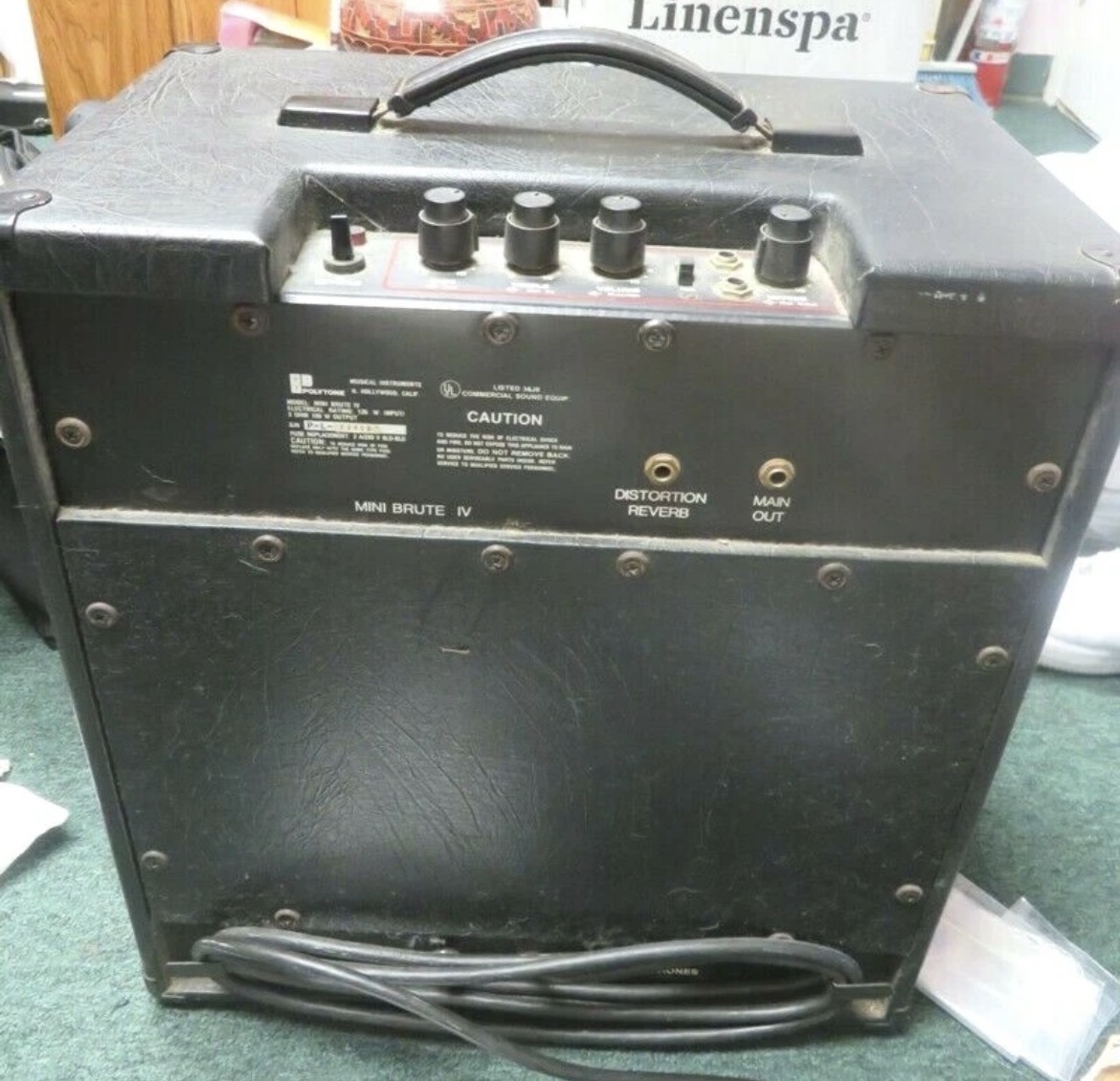 The back has a Distortion/Reverb jack, a Main Out, an Ext Speaker jack and Headphones jack. Date code on the speaker