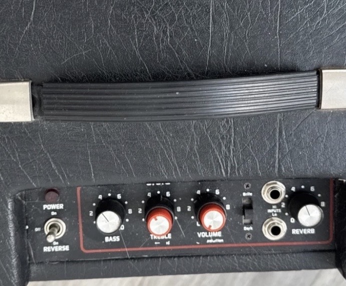 The controls from left to right are Bass, Treble, Volume and at far right, Reverb. There is a switch which is Gain -/+.