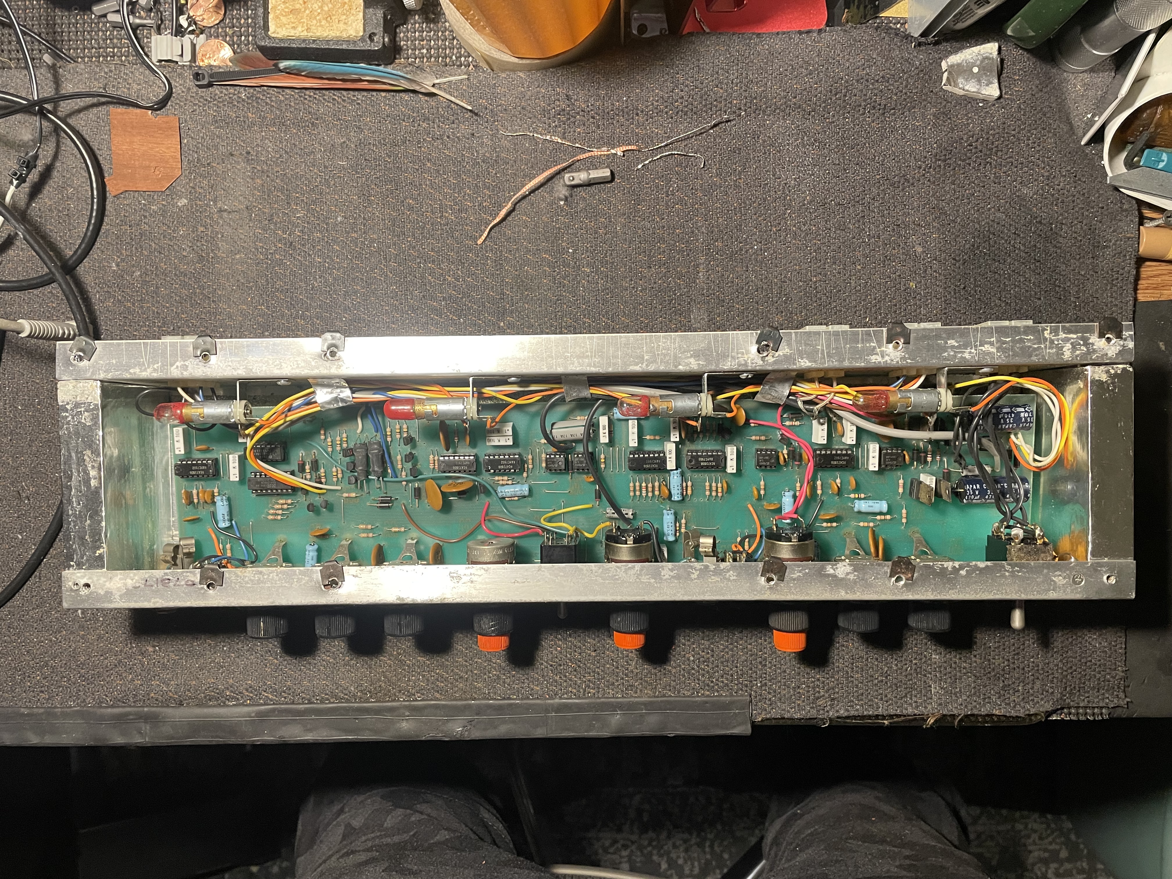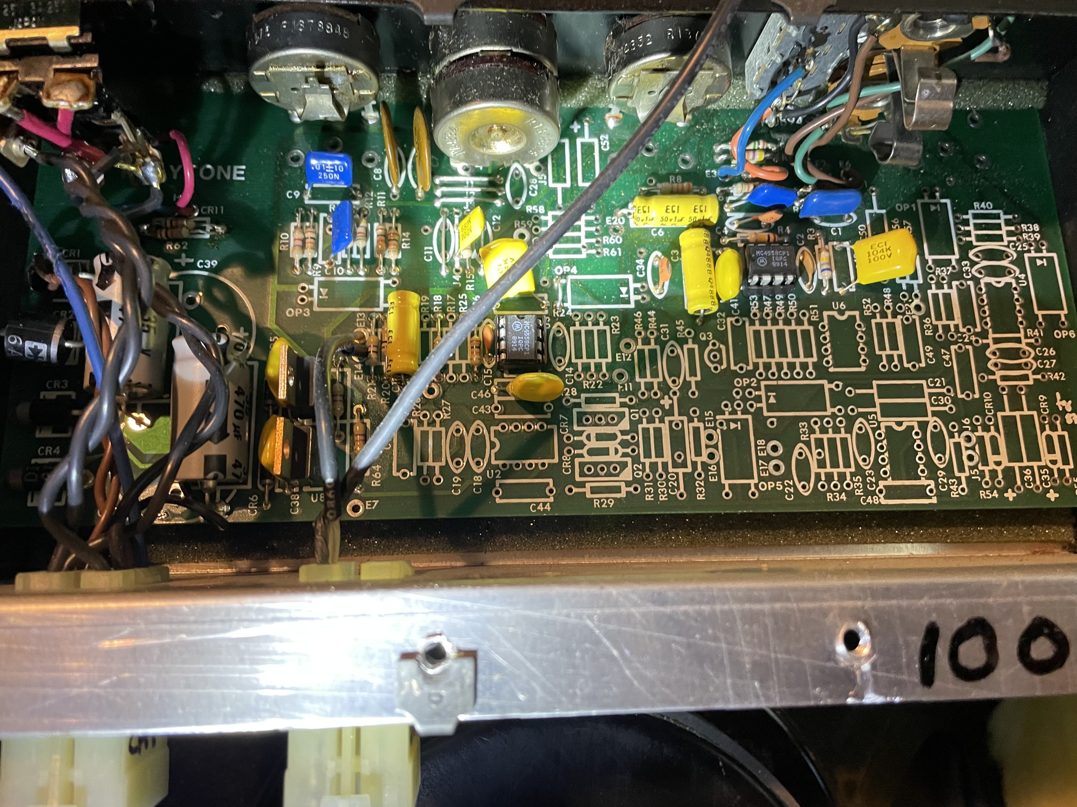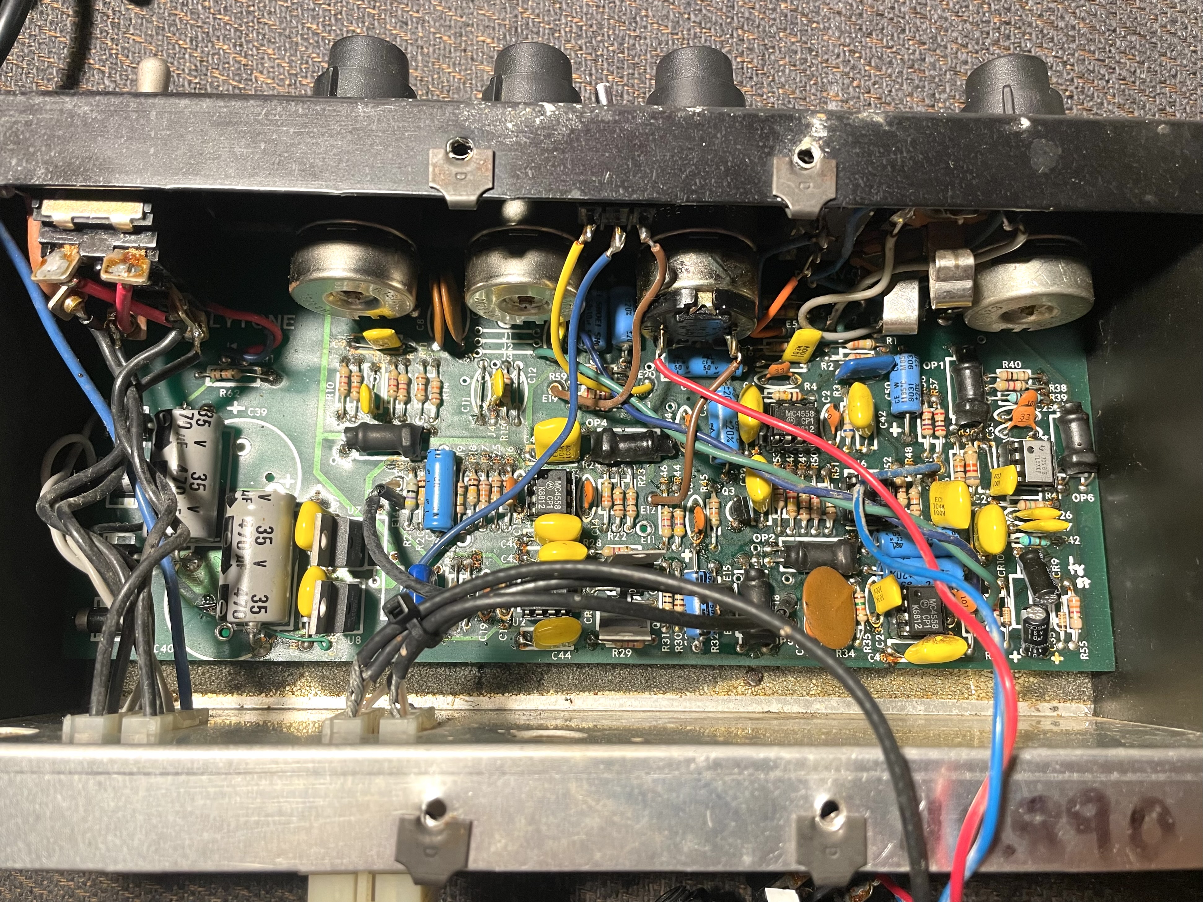 The DC power supply is at far left. The first opamp at left is an LM301. This is for the reverb circuit. The opamp to the right of that is an