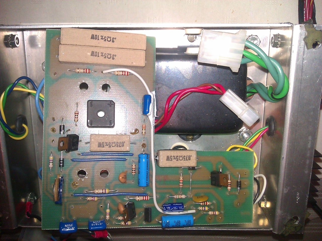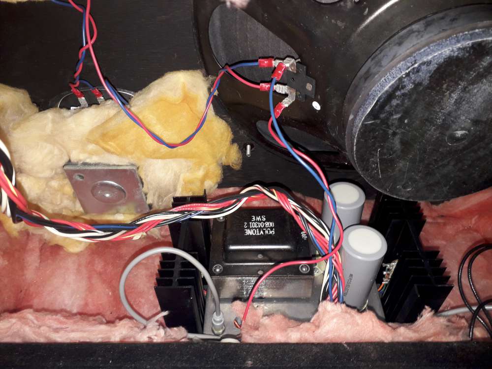 be a thermistor on one of the power transistors with wires from it going into the chassis. The large electrolytic caps are