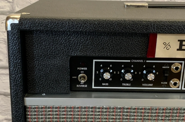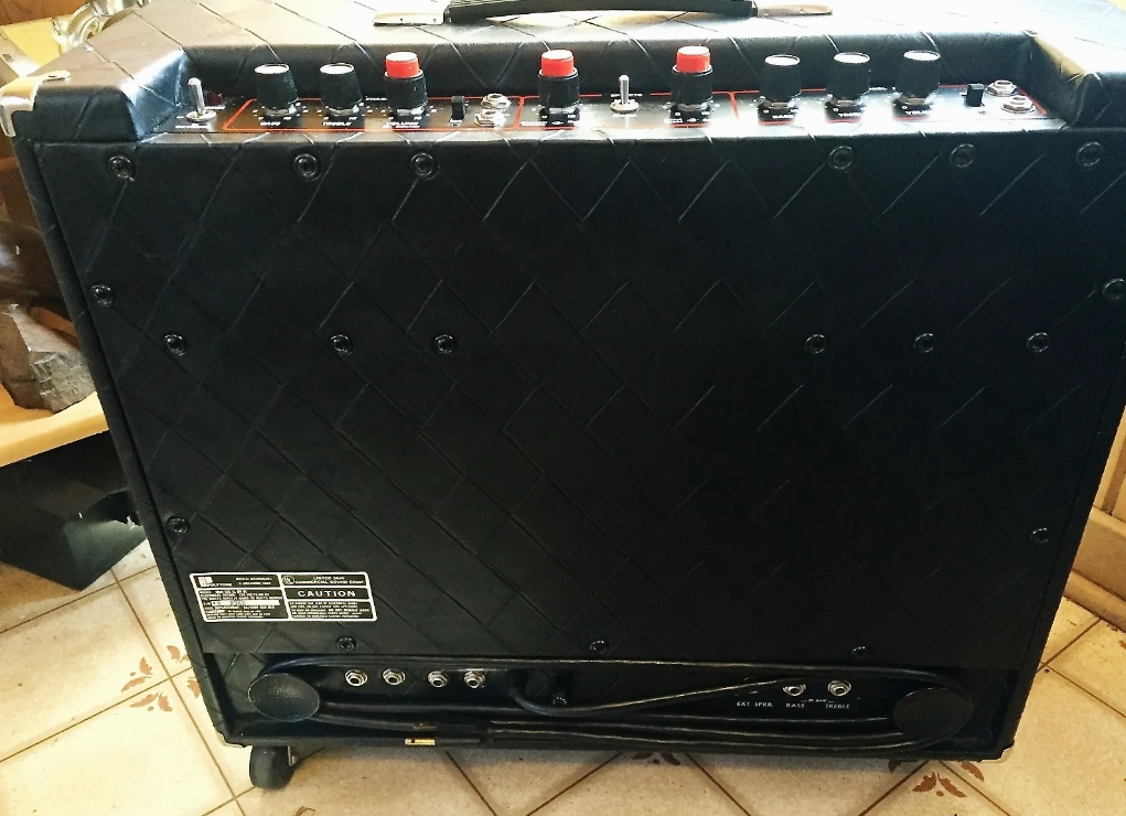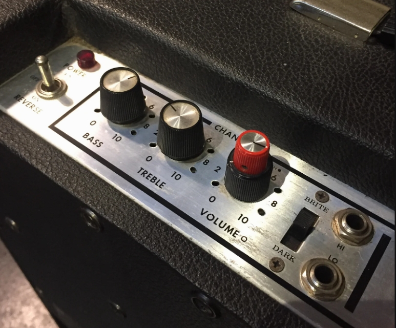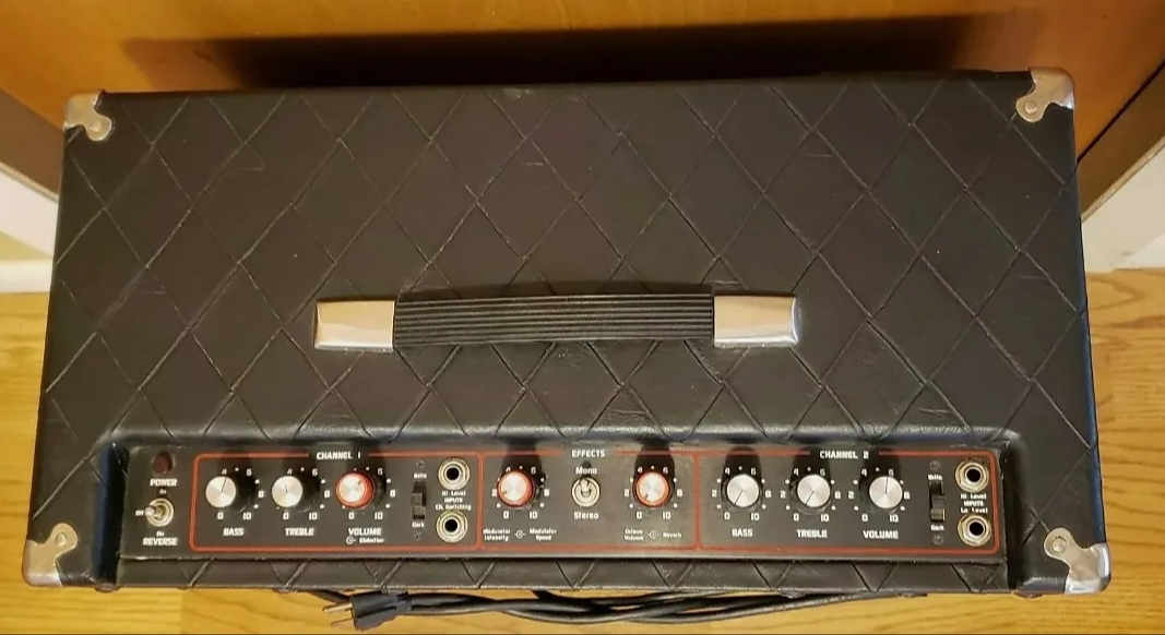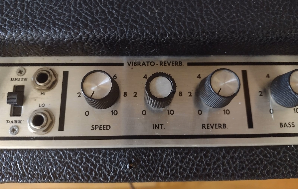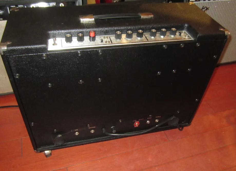 Some models also have a Mid tone control and a Gain +/- switch. It uses a small vertically mounted 2-spring Accutronics reverb tank (marked as 8DB2C1C),