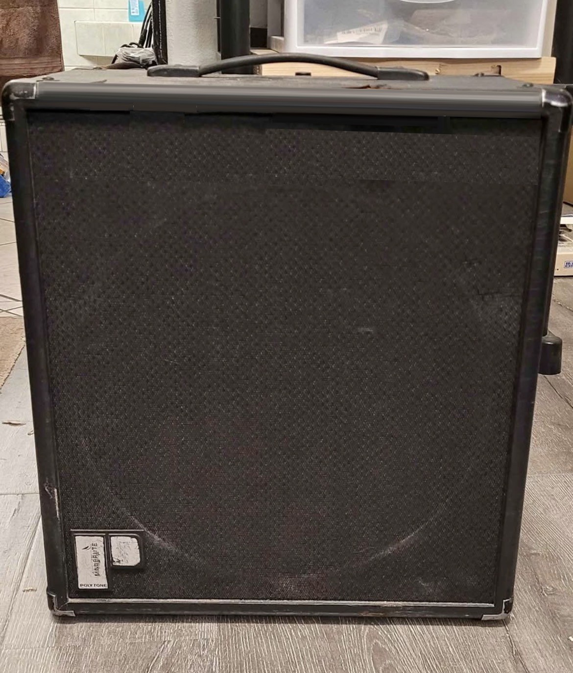 First series (1968 to early 1970s) -- Hard, rough surfaced black Tolex-like covering; silver-gray cloth applied directly to speaker baffle; rectangular metal Polytone label somewhere on the