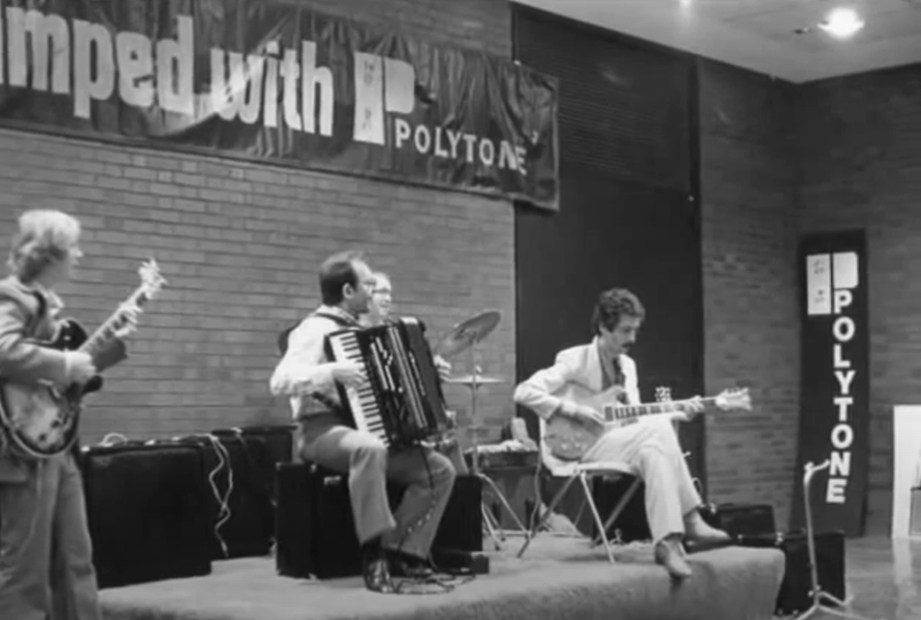 In this undated photo, there was apparently an event which was promoting Polytone. Tommy Gumina (accordian) is playing with Pat Martino (right) and Ron Eschete (left).