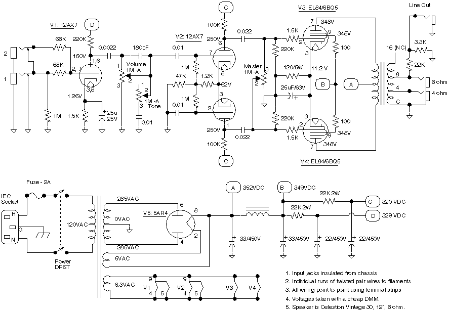 At start up, I checked all of my B+ voltages, and they measured pretty darn close to the schematic. In my amp, actual B+ voltages measured as follows: A - 350V, B - 347V, C - 314V and D - 321V. All of the other voltages measured very close to what is indicated on the schematic as well.