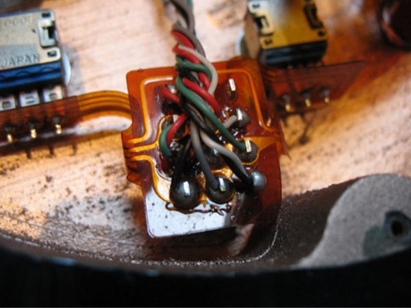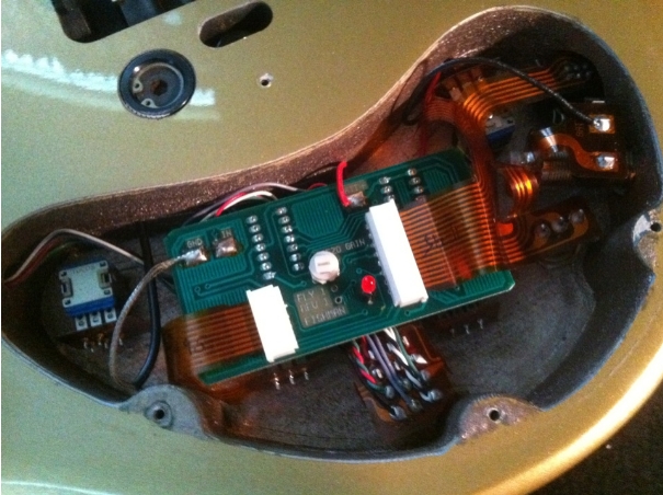 Finally, here is the electronics as originally designed. These original Fly models utilized a ribbon cable system which made for a very neat control cavity. There is also an LED which tells you that the circuit is getting power and also serves as a warning for when your battery needs to be replaced.