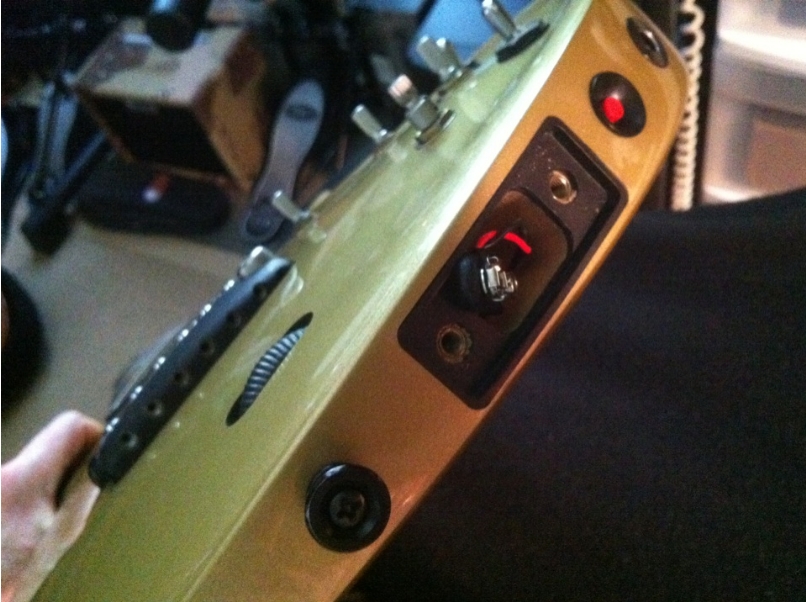 In this picture you can see the red mono/stereo button and the output jack. Pickup switching is much the same as my Mojo Nitefly except that this guitar does not have "coil tapping". One thing this guitar has that later "refined" Flys don't have is a master volume control that controls the volume for all pickups and a tone control for the piezo pickups, which I really like having.