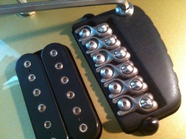 This is the now familiar Parker bridge with the 1st generation piezo saddles which look like large "BBs". The 2nd generation piezo saddles look like a dogbone. This bridge can be used in a fixed mode, bend down only mode and a balanced or "floating" mode. The pickups were made by DiMarzio especially for the Fly guitar. I think they sound really good, I was surprised that I liked them as a lot of the time I don't like OEM pickips in guitars.