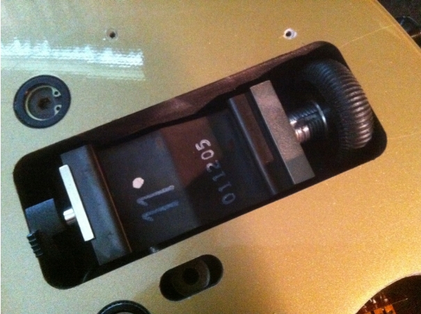 Just behind the bridge is the "balance wheel" which protrudes through both sides of the guitar body. This is used for when you want to use the bridge in balanced mode, like the familiar Floyd Rose "floating bridge". Here you can also see the battery compartment with the cover removed.