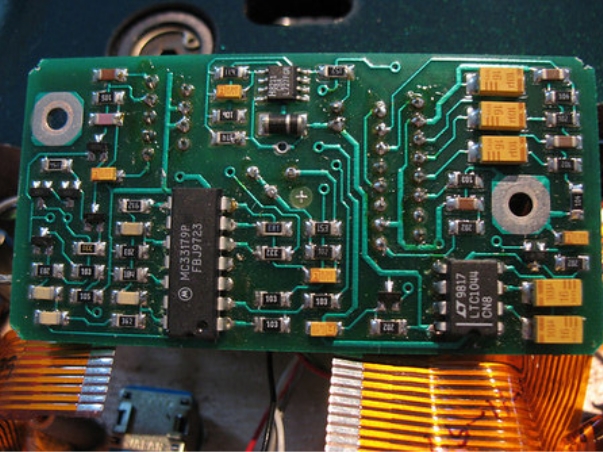 Here is the underside of the PCB. It's physically a lot larger than what is in the late model "refined" Flys, probably because at the time some of the active components were not available in an SMD package.