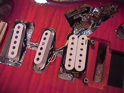 Here is the pickups from the backside. There is what appears to be a DiMarzio Super Distortion on the