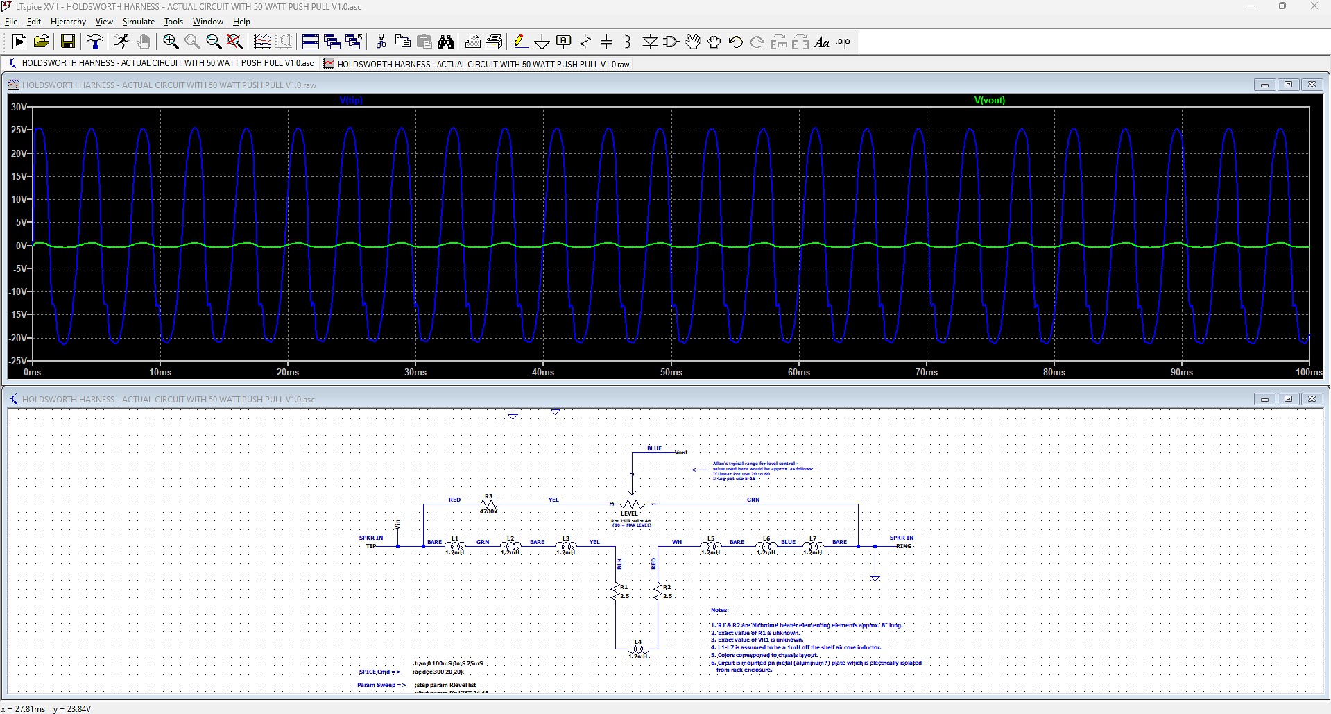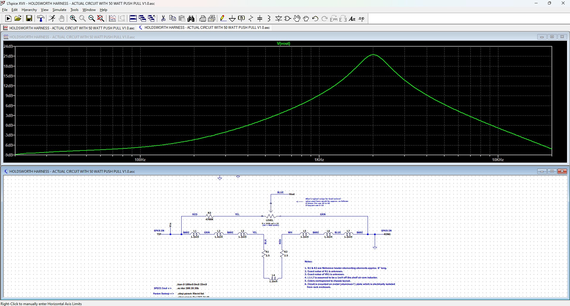 essentially what approximates the guitar amp speaker. The level control is taken straight off the input jack. Note that I gave the inductors a value of 1.2mH, which is what I estimate the 1mH inductors may actually be in reality due to the way they are fastened to the baseplate. It should be noted that my value of 1mH is based on some scribbles Allan made on one of his personal units, but I have also seen one of his units that said it contained seven 1.5mH chokes. For now I am going to stick with 1mH.
